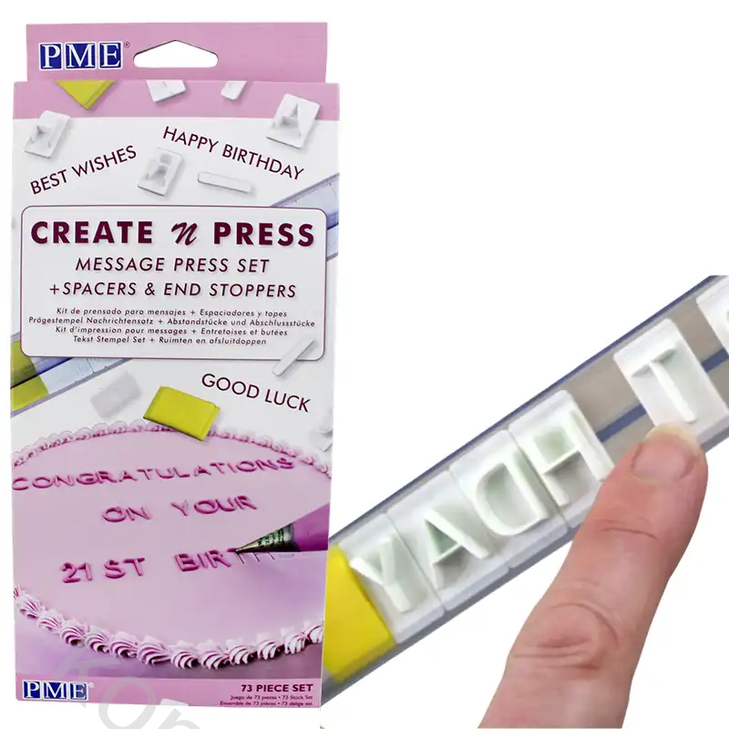PME Create N Press Message Set er et praktisk sett som gjør det enkelt å lage rene og jevne personlige meldinger på kaker. Med en smart guide holder du bokstavene rette og jevnt fordelt, noe som gir et profesjonelt resultat hver gang.