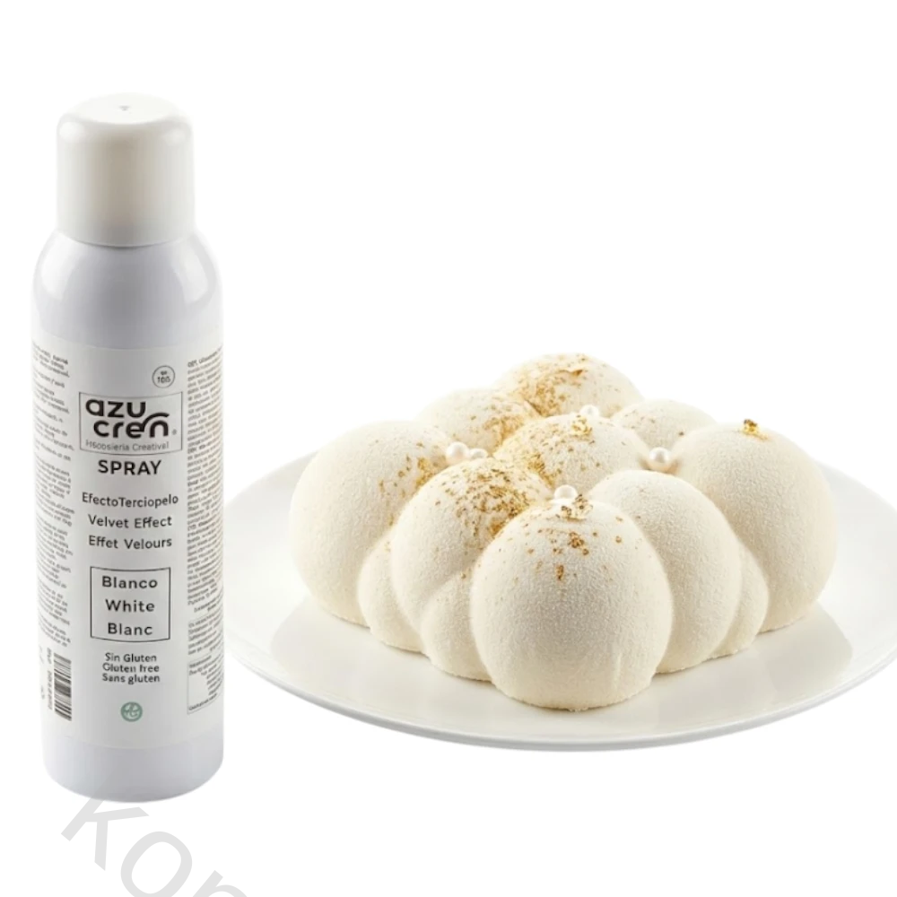 Azucren Hvit velvet spray er et profesjonelt dekorspray som gir en elegant og jevn fløyelsfinish på desserter.