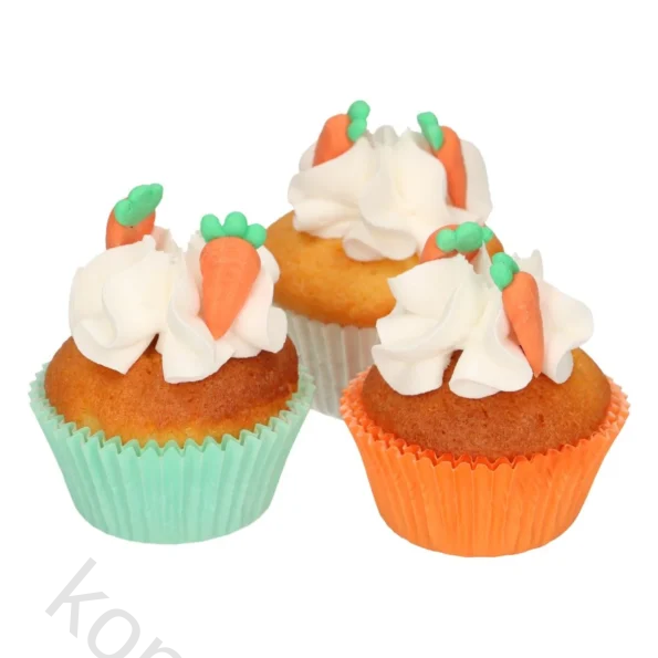 Hver gulrot er laget av spiselig sukker med naturlige farger og en lett vaniljesmak – klare til å plasseres rett på smørkrem, glasur eller fondant. Perfekt både til påske, bursdager og andre festlige anledninger der du vil legge til en liten, detaljert dekorasjon som løfter helhetsinntrykket.