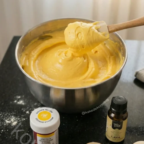 - Smak og fargeBegynn med ½ ts Azucren Champagne Essence. Pisk inn og smak underveis - tilsett mer om du ønsker en sterkere champagnekarakter.Ta en tannpirker, dypp litt i Wilton Golden Yellow, og stryk en liten mengde inn i kremen. Pisk på lav hastighet for å fordele fargen jevnt. Gjenta med små mengder til du får en varm, kremgul tone som på bildet.